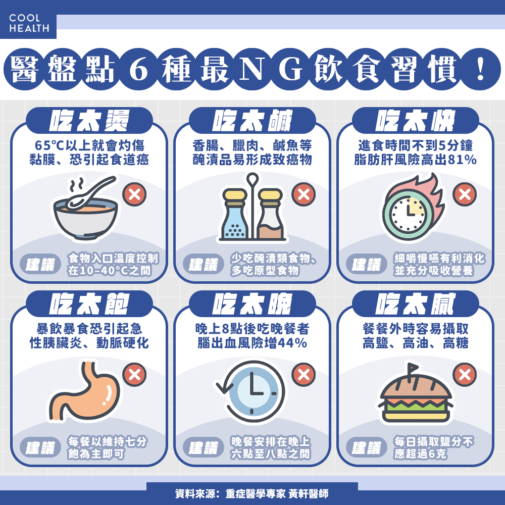 最後,黃軒醫師表示,「吃法決定活法」,不只有菸、酒會縮短壽命,錯誤的飲食習慣也會默默傷害身體。建議從今起改掉上述不良習慣,若對於飲食內容有所疑慮,應諮詢醫師或營養師之意見,避免「禍從口入」,讓每口食物都成為禍害健康的毒藥。