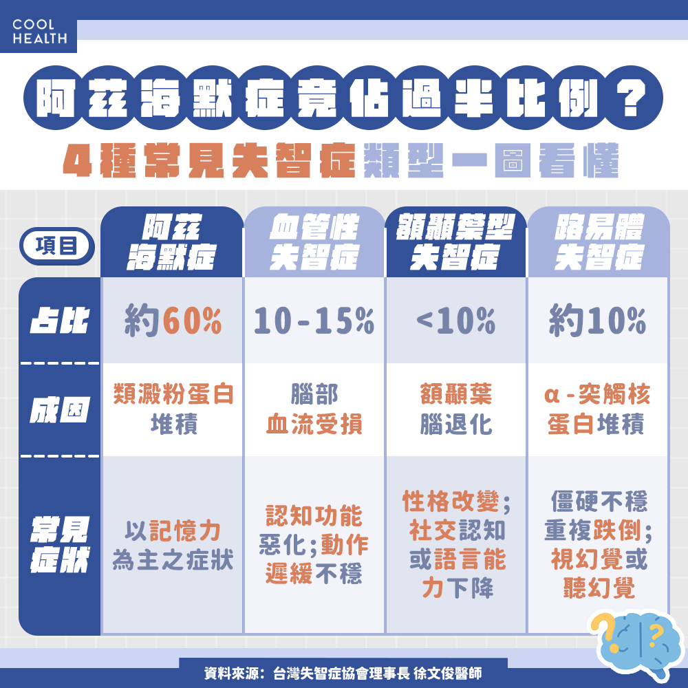台灣失智症協會理事長徐文俊醫師說明,「阿茲海默症」為失智症中最常見的類型,占總體患者比例約56.88%。與正常老化的「記得自己忘了什麼」狀況相比,阿茲海默症患者經常「忘了自己記得什麼」,早期容易出現記憶力退化、情緒起伏明顯獲理解能力變差等症狀。值得注意的是,民眾常將阿茲海默症與正常老化混淆,導致平均就醫時間延誤3.5年之久。