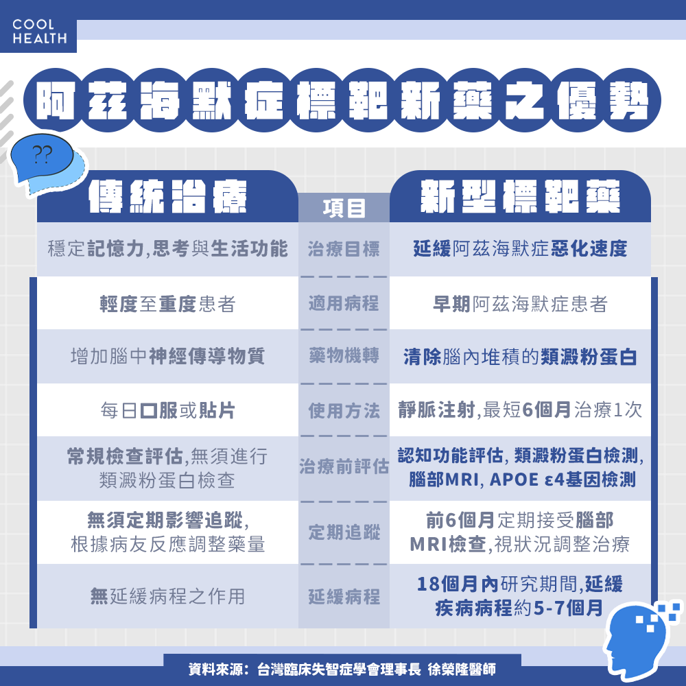 令人振奮的是,現階段已有新型抗類澱粉蛋白標靶治療問世,針對疾病根本機轉介入,直接鎖定毒性蛋白,活化免疫細胞清除斑塊、減少對腦神經的傷害,進而延緩疾病惡化。新型標靶治療有助病友延長維持認知與生活能力的時間,是提升「健康餘命」的關鍵,更為病友與家屬帶來嶄新曙光,堪稱是阿茲海默症治療二十年來的重要里程碑。