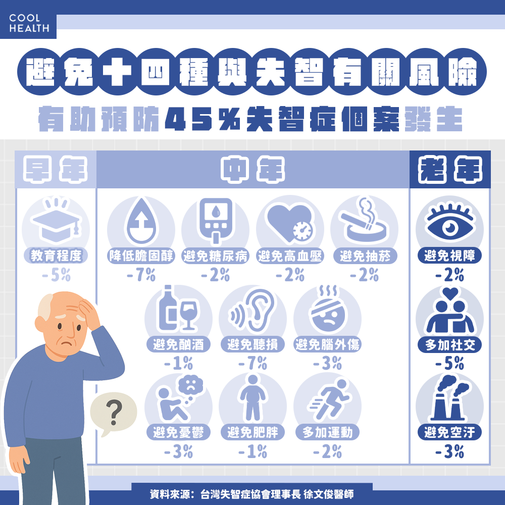 失智症風險因子並非不能改變,徐文俊醫師提醒,若能從日常生活中著手改善14項風險因子,有助於預防或延遲45%的失智症個案的發生。改善方式包含提升教育程度、矯正聽力與視力、妥善控制高膽固醇、糖尿病與高血壓等慢性疾病、維持健康體重、預防憂鬱與腦部外傷。避免抽菸與過度飲酒、養成規律運動習慣、保持良好社交互動,以及遠離空氣污染,都是促進大腦健康的重要行動。