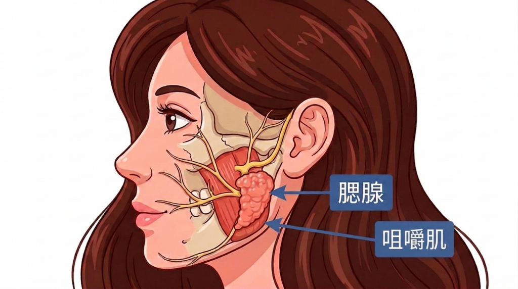 然而,位於咬肌上方、從下顎角延伸至耳下的腮腺(Parotid gland),往往才是被忽略的隱形元兇。腮腺是人體最大的唾液腺,當體積異常增大,同樣會撐起下臉部兩側,外觀上與咬肌肥大極為相似,難以單憑肉眼區分。