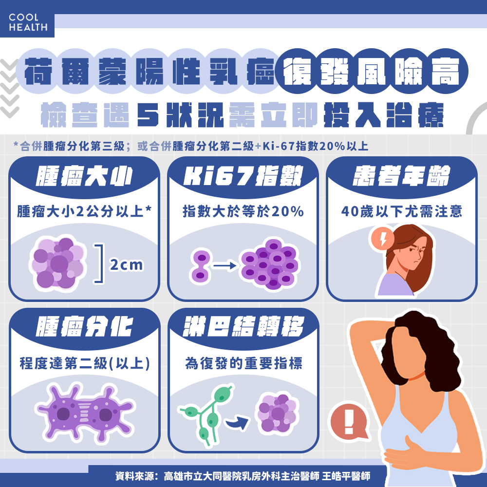 王皓平醫師強調,當發現患者的腫瘤大於5公分(或腫瘤大於2公分,且合併腫瘤分化第三級;或腫瘤分化第二級合併Ki-67指數20%以上)、Ki-67 指數(數值越高腫瘤生長越快)大於20%、有淋巴結轉移,以及腫瘤分化程度較高(第二級)等,就要注意潛在的復發風險。「值得注意的是,普遍認為較為年輕乳癌,例如40歲以下之患者亦為高復發風險群之一!」