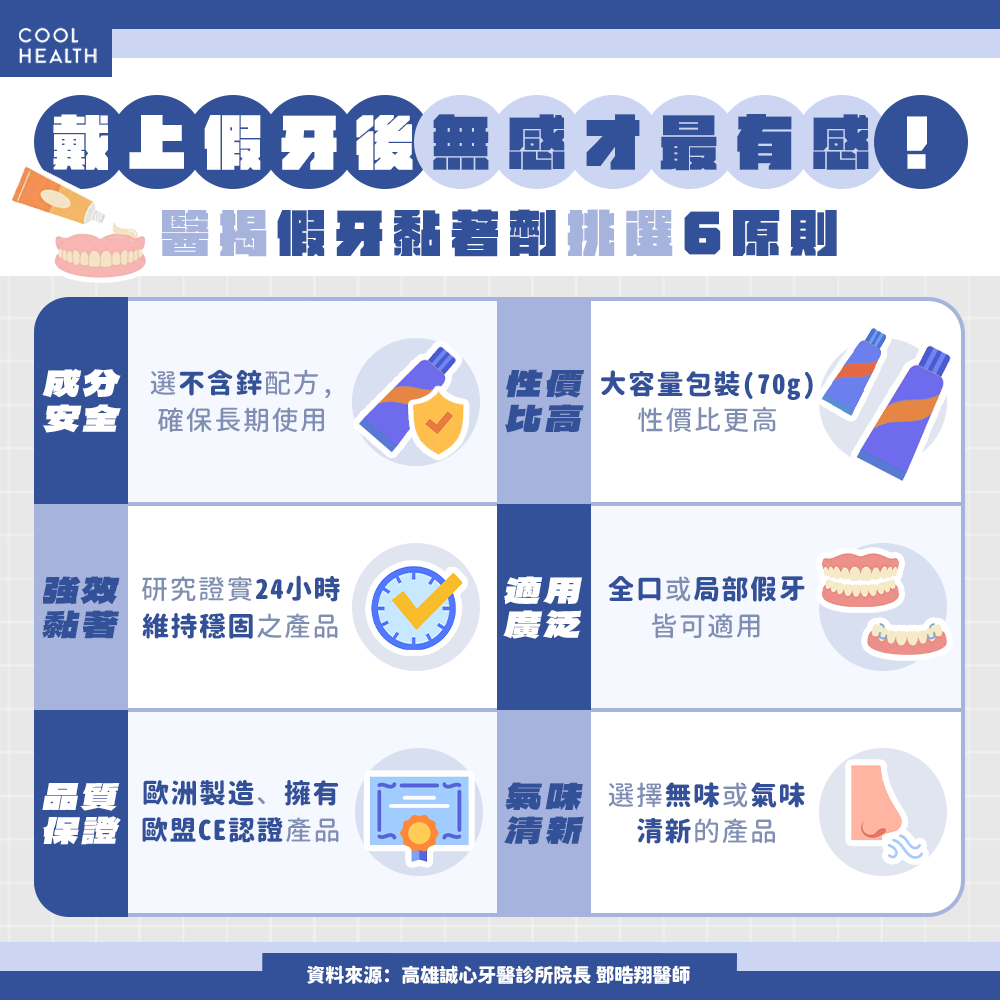 假牙黏著劑產品琳瑯滿目,缺牙者該如何選擇最適合的產品?鄧晧翔醫師建議,缺牙者可依據以下六大原則進行挑選: