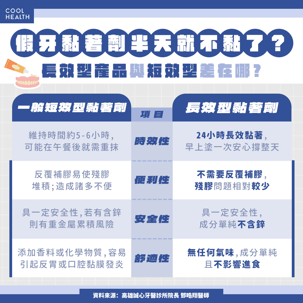 市面上假牙黏著劑琳瑯滿目,「時效性」是缺牙者最在意的指標之一。鄧晧翔醫師分析,一般短效型黏著劑的維持時間約為5至6小時,缺牙者可能在午餐後就需要重新塗抹,不僅對日常生活造成諸多不便,反覆的補膠也容易導致殘膠堆積在口腔黏膜上,增加清潔難度與衛生疑慮。