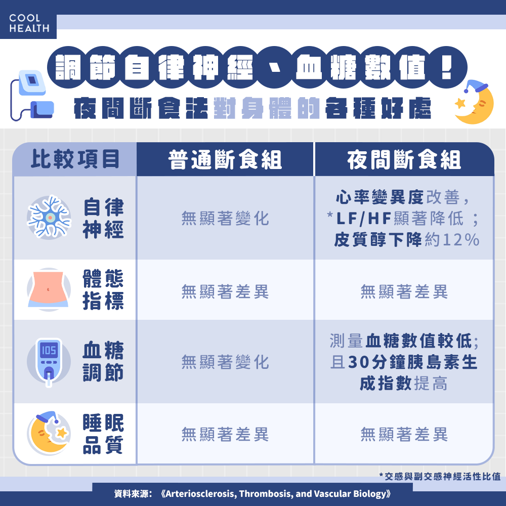 過去部分斷食研究曾提出「餓肚子睡覺會影響睡眠」的擔憂,甚至有文獻認為,飢餓感可能會降低睡眠效率。但該研究透過客觀的PSG檢測證實,將最後一餐提前至睡前3小時,並不會破壞睡眠巨觀結構;包含總睡眠時間、睡眠效率、入睡後醒來時間,以及各睡眠階段的比例,皆與對照組無異。