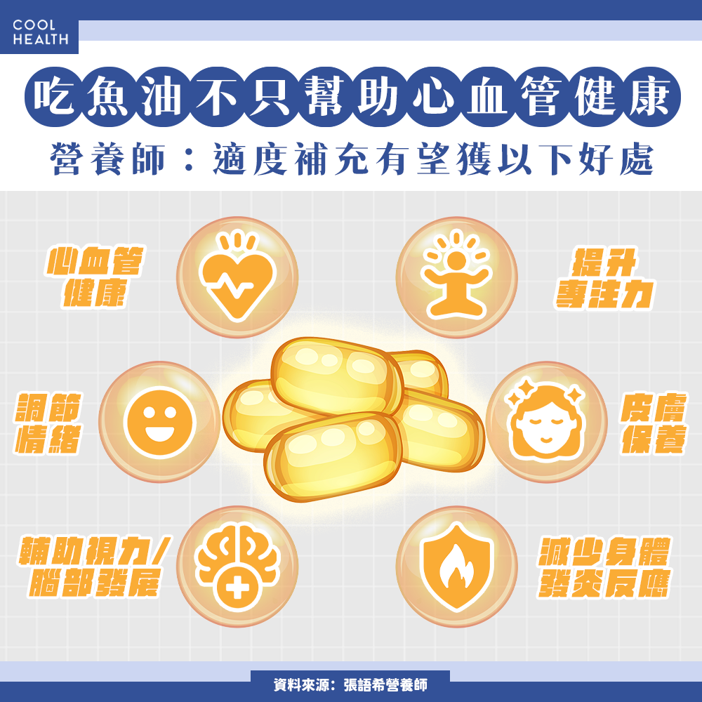 ❝ 快速摘要:張語希營養師提醒,選購魚油應注意6大條件:1. EPA+DHA總量應達每日建議500-1000mg;2. 濃度達70%以上為高濃度魚油;3. 選擇吸收率高的rTG或TG型態;4. 檢查有無IFOS、GOED等第三方認證;5. 原料來源以小型魚為佳;6. 魚油無腥味代表品質穩定。魚油有助心血管、情緒穩定與抗發炎,但凝血異常者應避免補充,建議事先諮詢醫療專業人員再行選購。