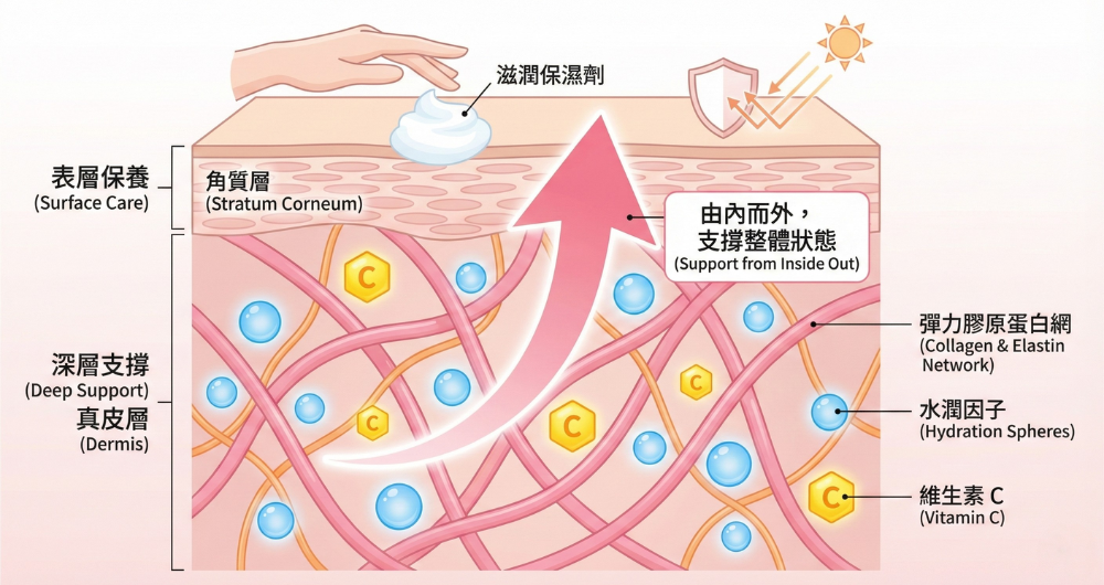 如圖解所示,真皮層內部是一個複雜的微生態:由交織的「彈力膠原蛋白網」作為核心骨架,搭配「水潤因子」填補空隙,同時需要「維生素 C」來輔助結構穩定。這正是口服保養受到重視的原因:透過高生物利用率的超微分子膠原蛋白,提供基底所需的建築材料,達到「由內而外,支撐整體狀態」的保養目標。
