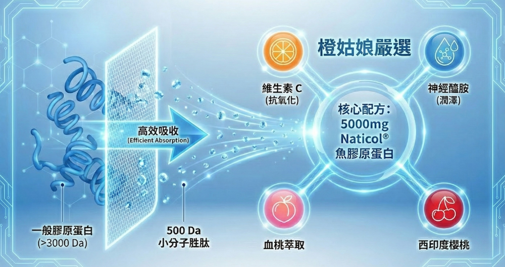 挑選膠原蛋白應著重於「分子大小」、「足量添加」與「複方協同」三大指標。以近期受到討論的指標性產品「橙姑娘」為例,其配方邏輯便體現了現代科學保養的趨勢: