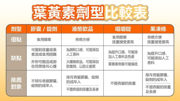 營養師蔡卉宣指出,營養補充品依成分吸收率、保存性與適口性分為不同劑型,常見有膠囊、錠劑、飲品、粉末與果凍狀,膠囊的好處是添加物較少穩定性高,錠劑的優點是相同體積下可以容納最多原料,飲品、粉末、果凍狀適合對膠囊錠劑排斥,或是有吞嚥困難的兒童與銀髮族。不論是哪一種劑型,消費者挑選時,可先從食用的偏好與習慣考量,並且優先從成份配方、有效含量,與實證功效來挑選適合的葉黃素。