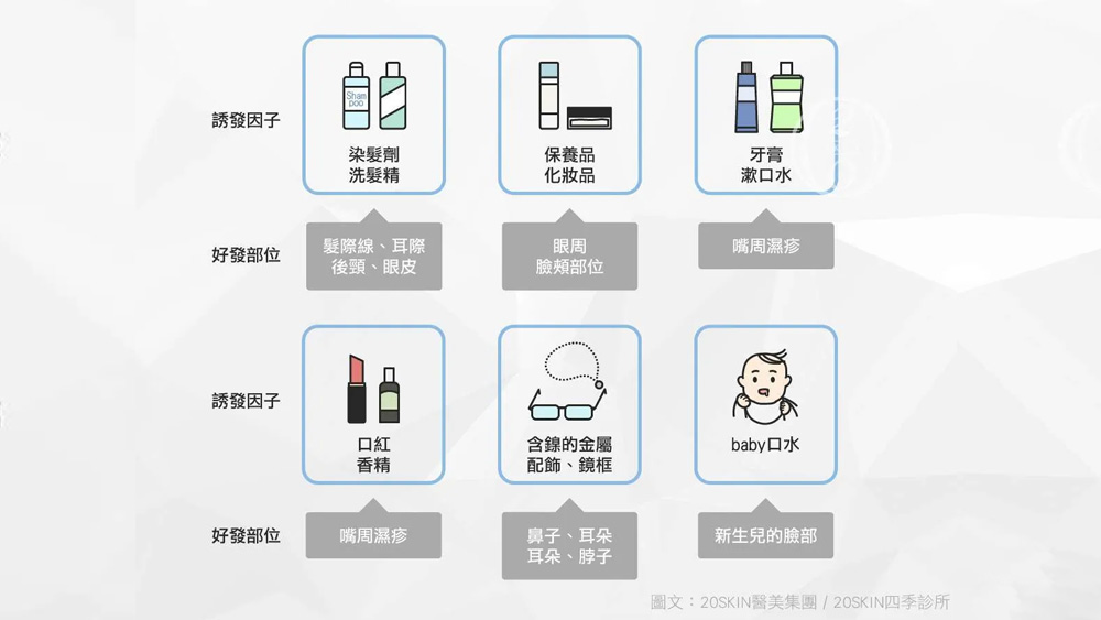 - 染髮劑、洗髮精:對苯二胺或刺激性界面活性劑,常影響髮際線、耳際與眼皮