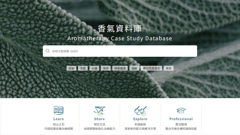 你是否也好奇:「我手上這瓶精油,到底還有哪些作用?」許多人聽了銷售人員介紹後就買了精油,但拿回家後除了滴在擴香儀裡,往往不知道還能怎麼用,久而久之就擺到過期;告訴大家一個免費好用的芳療百科:香氣資料庫。彙整上萬筆相關文獻與使用紀錄,提供一般民眾作為芳療應用的參考資訊。