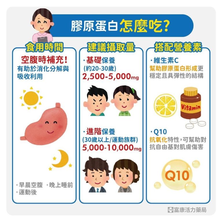 膠原蛋白屬於蛋白質類營養素,可在空腹時補充,例如:早上起床後或晚上睡前,或者是安排在運動後補充。 - 每日建議攝取量