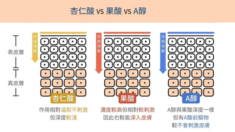 在眾多煥膚成分中,果酸、杏仁酸與 A 醇最常被應用,而其中 A 醇因兼具作用深度與低刺激性,逐漸受到更廣泛關注。