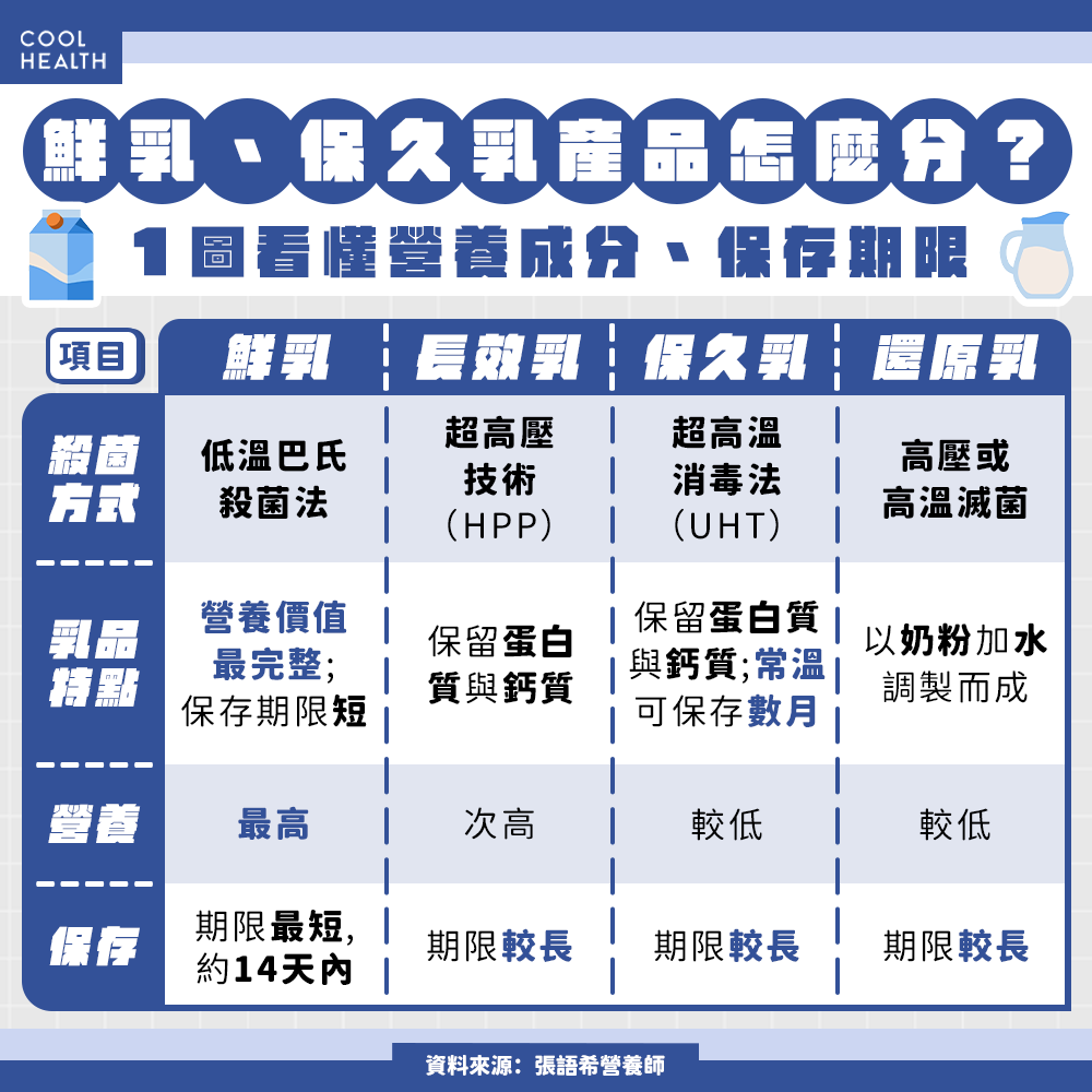 2.長效乳。利用超高壓技術(HPP)滅菌。營養價值相較於鮮乳略少,但仍富含蛋白質。