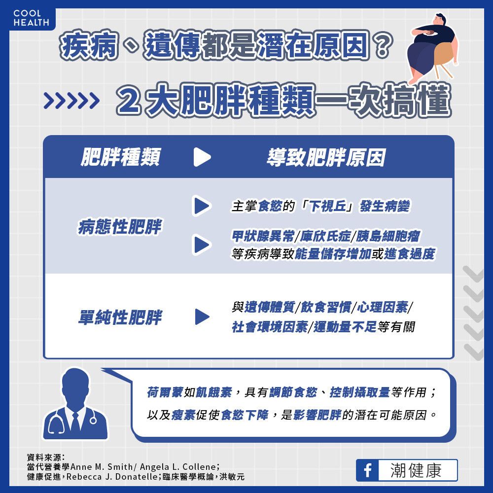 造成肥胖的原因可分為「病態性肥胖」與「單純性肥胖」兩類。病態性肥胖可能原因是主掌食慾的「下視丘」發生病變,或是甲狀腺功能異常、庫欣氏症、胰島細胞瘤等疾病,導致能量儲存增加或進食過度。一般性肥胖則認為與遺傳體質、飲食習慣、心理因素、社會環境因素、運動量不足等現象有關。