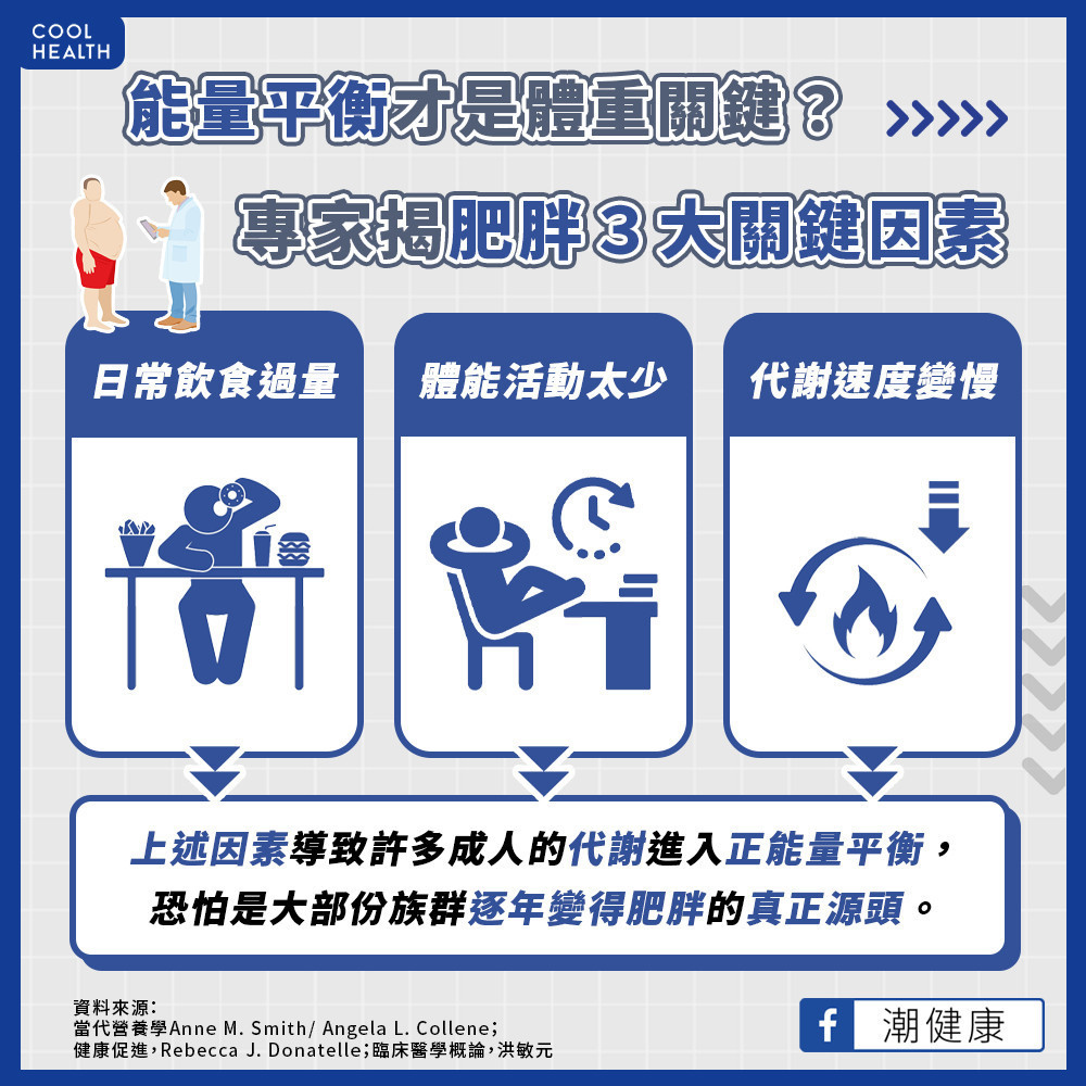雖然肥胖原因眾多,「能量平衡」仍是維持健康體重的關鍵。身體吸收來自食物的卡路里,以及代謝、消化、吸收、運動營養及身體活動之間的熱量差額就是能量平衡。當有過剩的能量儲存就會造成體重上升,稱為「正能量平衡」。反之,消耗的能量大於攝取的能量,將使體重下降,稱之為「負能量平衡」。